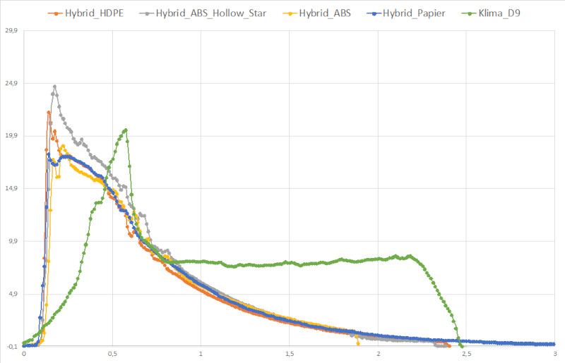 nachdem ich aktuell daran bin meine erste Rakete mit dem Microhybrid zu basteln, welchen ich mir bei Eclipse Rocketry bestellt hatte, war ich sehr länglich auf der Suche nach Schubkurven für besagten Treibsatz. Gleichzeitig hatte auch ich den Wunsch verschiedene Reloads selbst zu drucken und miteinander zu vergleichen. Am Schluss habe ich einen Arduino, eine Wägezelle von Ali.com und ein kleines Relais verbaut...im Grunde so wie man das im Internet an vielen Stellen findet. Die Halterung ist aus einfachem PLA gedruckt. Die Samplerate liegt bei ~80 Hz. Als Motor zum testen habe ich einen Klima D9-P genommen, für welchen ich auf einen Gesamtimpuls von 19,5 Ns und einen durchschnittlichen Schub von 8,5 N gekommen bin. Für die Gesamtkosten von nicht einmal 10€ war ich von dem Ergebnis positiv überrascht. Nun ging es also zum Hybrid und nachdem ich mit Jürgen viele, viele Versuche und Geduld in das Zünden des Hybrids investiert habe konnte ich schließlich sehr verlässlich zünden und die verschiedenen Grains testen. (Papier, HDPE, ABS, ABS mit Stern, ABS "Hollow Star". Am Ende habe ich die besten Erfahrungen mit dem nach innen als Stern ausgeprägten Grain aus ABS gemacht, zündet super zuverlässig und bringt es auf D9 mit 15,3 Ns Gesamtimpuls. Hier noch ein Link zu meinem Versuchen und die Frage an alle Hybridexperten was es mit dem "pfurtzen" des Hybrids nach Brennschluss auf sich hat. (Micro Hybrid Rocket Engine ) Als Anhang zum Post findet ihr einige Schubkurven als eng-File, erstellt mit dem ThrustCurveTool, vielleicht kann Sie ja jemand brauchen. Ich plane damit jetzt meine nächste Rakete. Hoffe ich habe mit dem sehr alten Thema Microhybrid und meinem sehr einfachen Prüfstand niemand gelangweilt. Viele Grüße, Matthias Geändert von MatthiasA am 09. Juni 2021 um 22:50 |