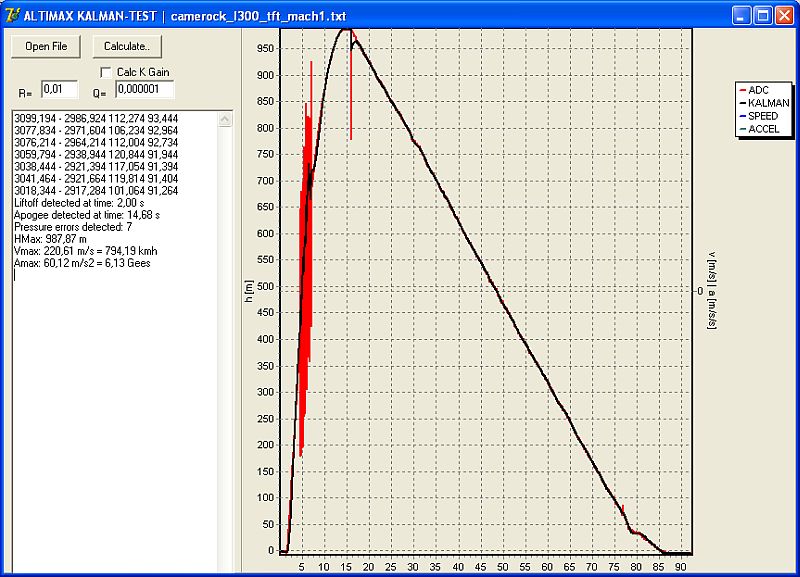 Die Entwicklung ist fast fertig, mit der Simusoftware kann man Flugdaten durch das Filter schicken und dann schön sehen wie exakt es den Gipfel findet, bei manchen Kurven mutet das wie Zauberei an. Ein Bildchen unten zeigt das sehr schön, trotz Extremer Störungen arbeitet der Altimeter noch korrekt und erkennt den Gipfelpunkt perfekt. (Apogee detected at time: 14,68 s). Das ganze ist auch schon im Altimax drin, muss dort aber noch getestet werden.
