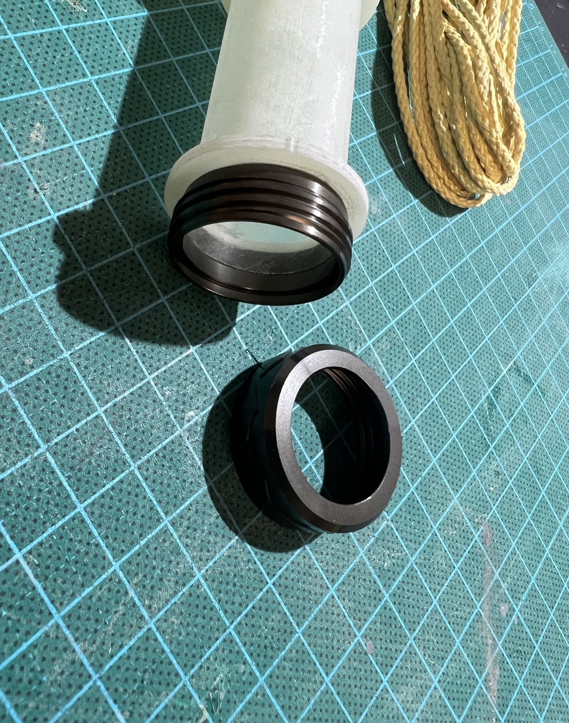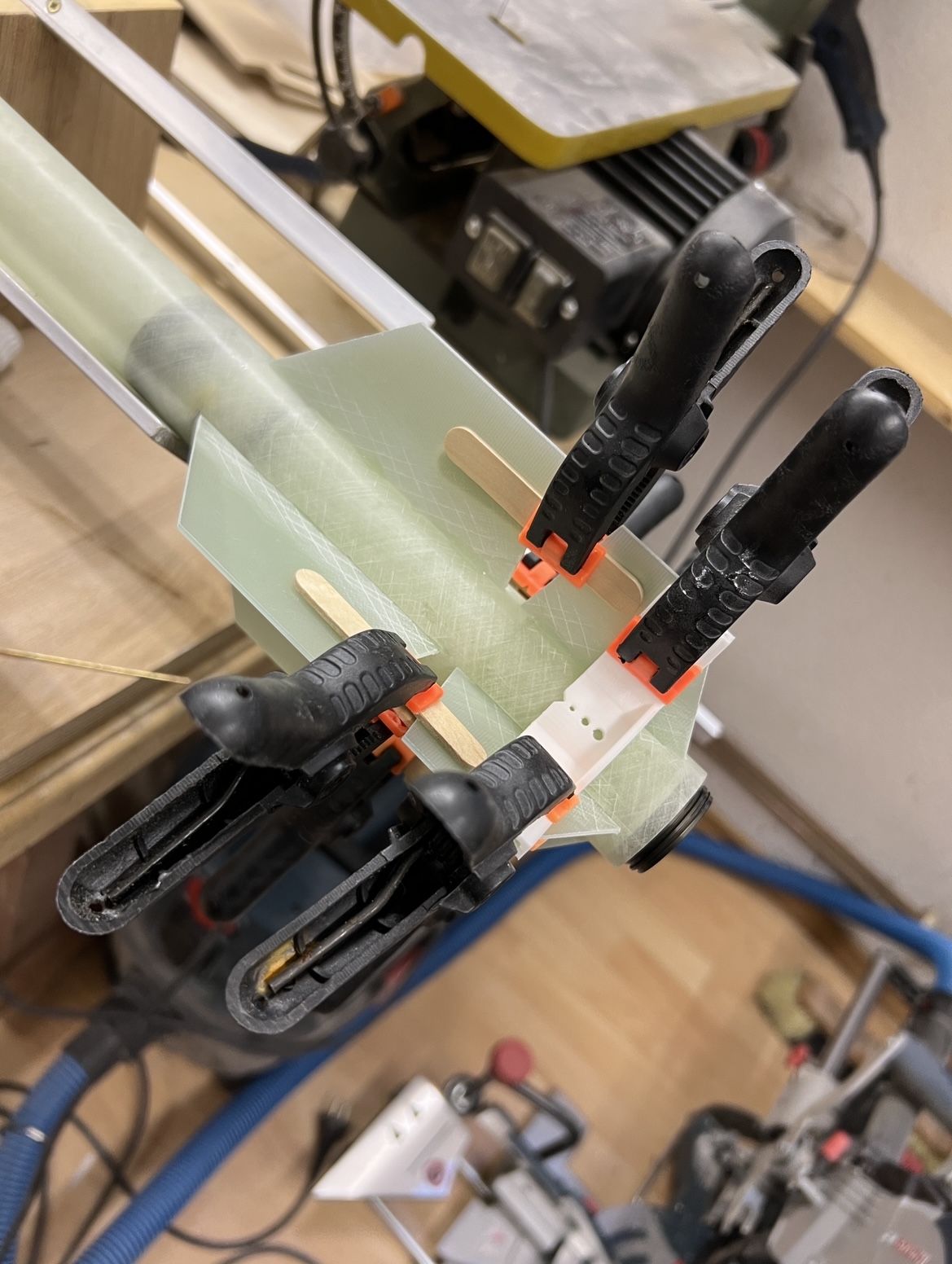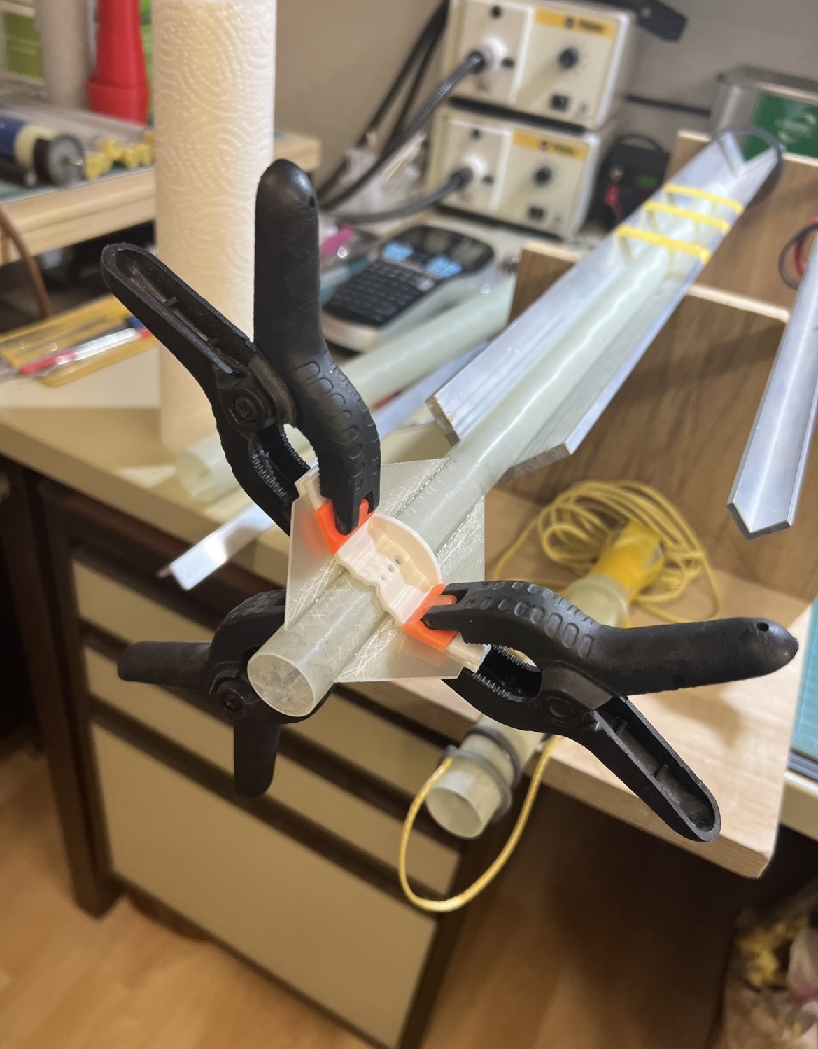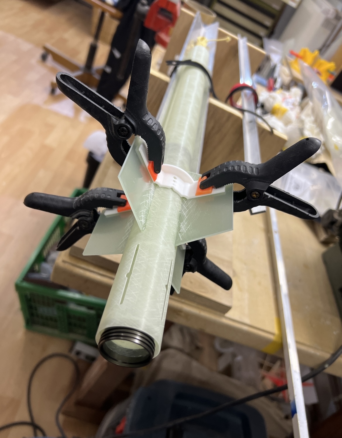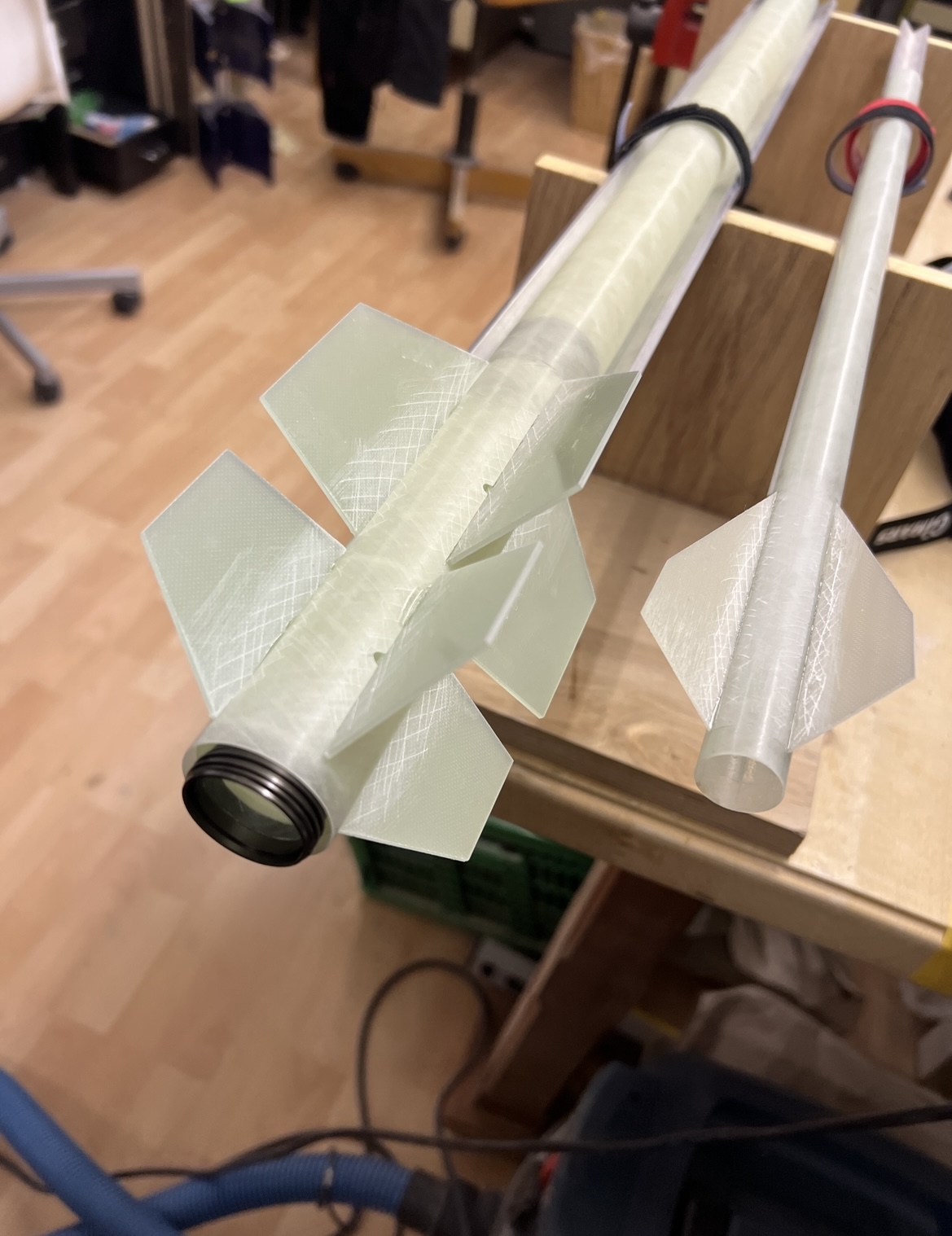 Und wieder ein wenig weiter … Das zweite set Finnen … Alle Finnen sind angeheftet … Ich hatte die Körperrohr Schlitze jeweils an einer Stelle mit dem Proxxon etwas geöffnet . Hier habe ich jetzt mit einer Spritze in jede “Kammer” ein definiertes Volumen Harz gegeben. 1ml in die großen vorne und 0,5ml in die kleinen hinten … alles mit Klebeband abgedichtet und dann sehr lange in alle Richtungen gedreht … das Harz hat sich so entlang aller innen Stosskanten gesetzt und quasi mini fillets ausgebildet .. im unteren Bild kann man gut sehen wie alles benetzt ist .. Bei der kleinen habe ich schonmal mit den außen Fillets angefangen … Heute also später geht es dann weiter . Grüße Marco