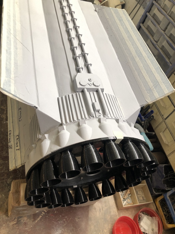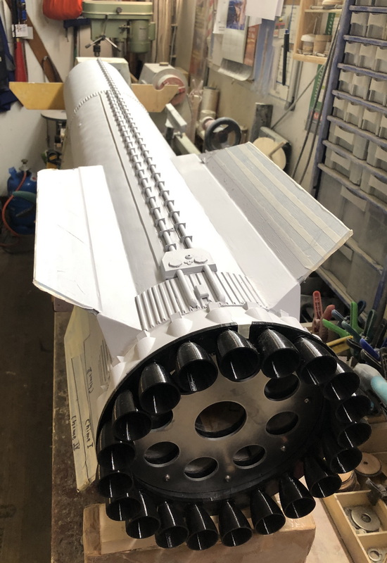 Der Triebwerkskranz ist leider nur ein Hingucker und wird am Ende nicht mitfliegen, weil die Druckteile die Abgase aus den Clustermotoren nicht überstehen würden.
