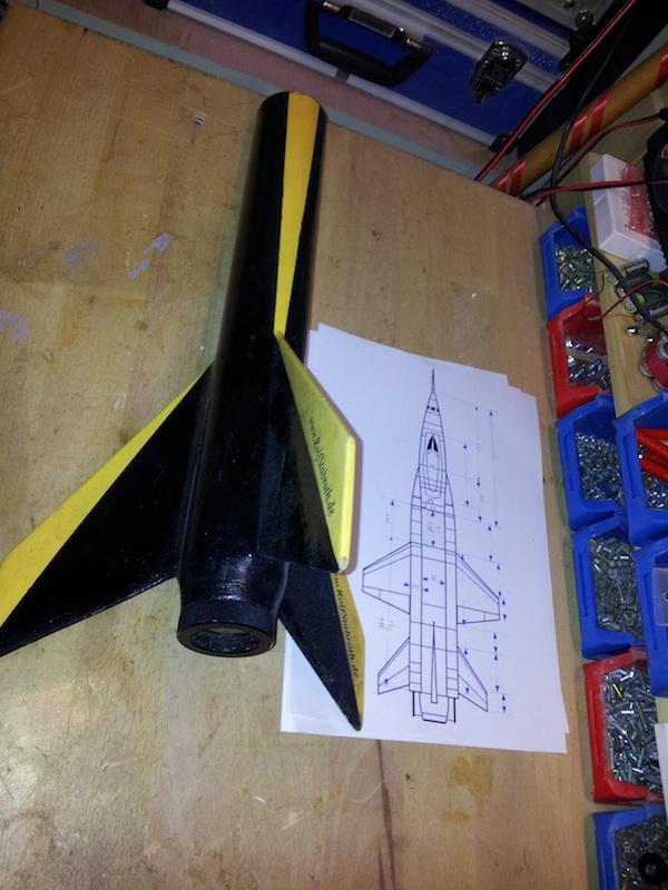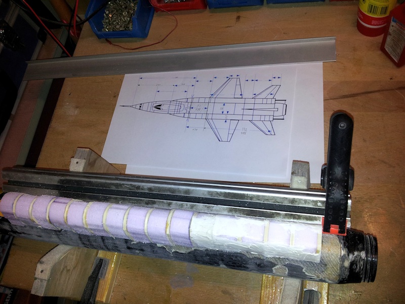 Ich habe mich ja echt überwinden müssen, meine alte Black Brant, welche seit 2005 33 erfolgreiche Flüge und einen Absturz hinter sich hatte öfters umgebaut wurde, mit mehreren Elektroniken geflogen ist, zu schrotten und was anderes draus zu bauen. Die X15 habe ich schon lange bewundert und die Form ist so geil, dass ich die Abmessungen so upgescalt habe, dass es auf das Black Brantrohr passt. So brauche ich Motorhalterung, Elektronikbay etc. nicht neu bauen, sondern ich kann viel übernehmen. Ritsch, ratsch, die Finns abgesägt, und das Rohr glatt geschliffen. nun gilt es die komplizierte Grundform mit den Flügeln zu schaffen. Die seitlichen Staurohre oder was das auch immer ist, werde ich in Sandwichebauweise Sperrholzscheibchen und Styrodur herstellen. Grüße, Rolli Geändert von Rolli am 13. Dezember 2013 um 18:13 |