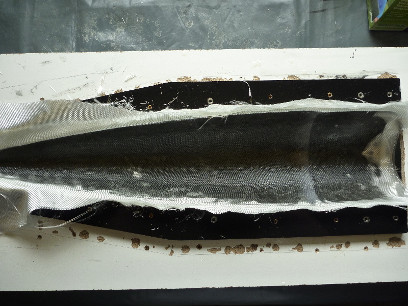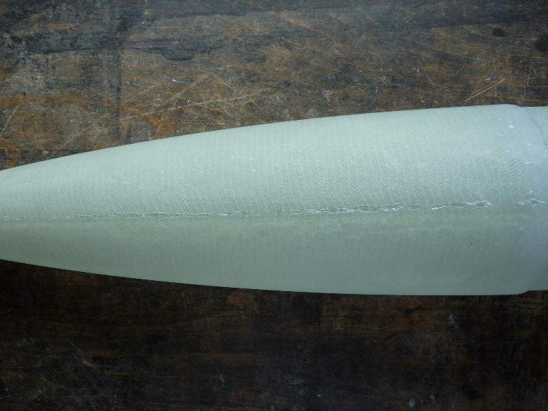 Nach dem Härten das Öffnen der Form: Schön zu sehen die letzte PVA-Trennschicht als dünner Film. Das ganze Thema Eintrennen kann dabei gar nicht hoch genug bewertet werden. Ich empfehle hier sehr sorgfältig zu sein. Zur Festigung der Spitze ist noch "Epoxybrei" eingefüllt.