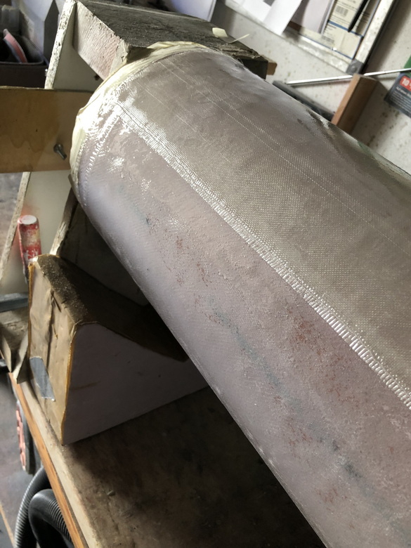 Die dritte Lage ist drauf. Hier habe ich ein anderes Glasfilamentgewebe genommen. Es hat eine andere Struktur und ergibt eine glattere Oberfläche. Auf ein möglichts geraden Anfang kommt es an. eigentlich sind es ja schon 4 Lagen, da es bei einem Meter Gewebe ca 1,5 Umdrehungen sind. Für das Rohr (1m) habe ich insgesamt 3 qm und 450g Harz/Härter verarbeitet.