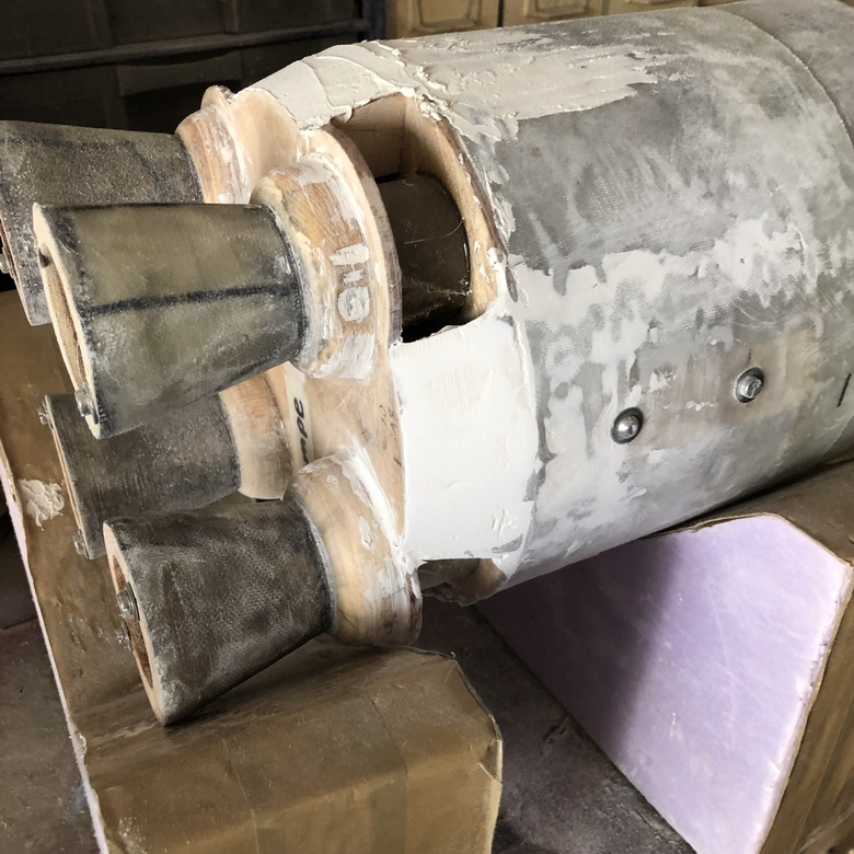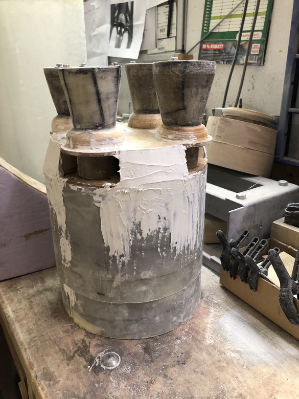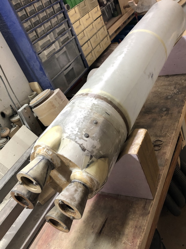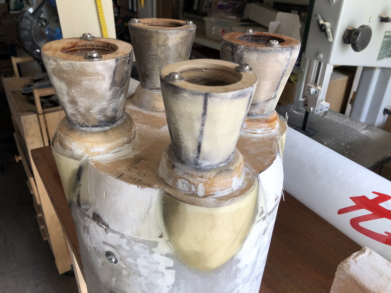 Der Motorblock ist in seine Hülle eingeklebt. Gleichzeitig habe ich den Kupplerring zum Hauptrohr eingeklebt. Das ist nun bombenfest. Ein bisschen die konischen Übergänge gespachtelt und geschliffen, ein Vorgeschmack auf kommnde Zeiten.
