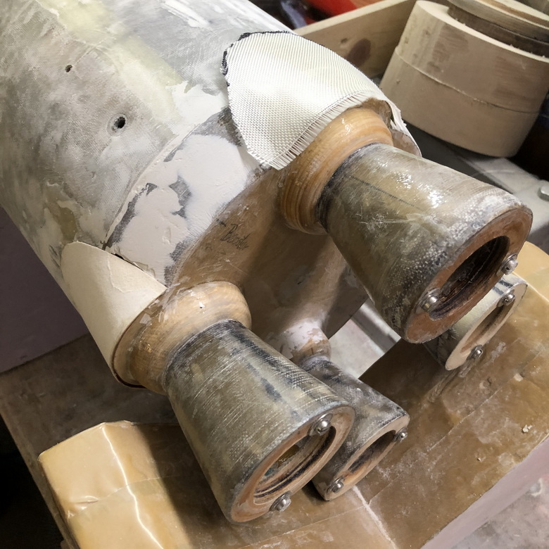 Die nächste Lage ist laminiert und die dritte wartet schon. Beim erneutem raufschieben auf den Kern ist natürlich das Backpapier zerknittert und musste entfernt werden. jetzt muss man das Laminat an dem Rand gut abkleben, so dass kein Harz zwischen Kern und das laminierte Rohr hineinläuft.