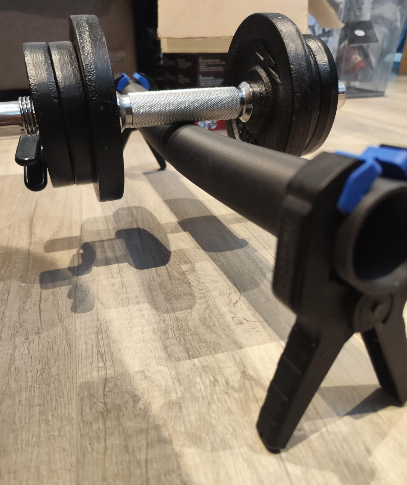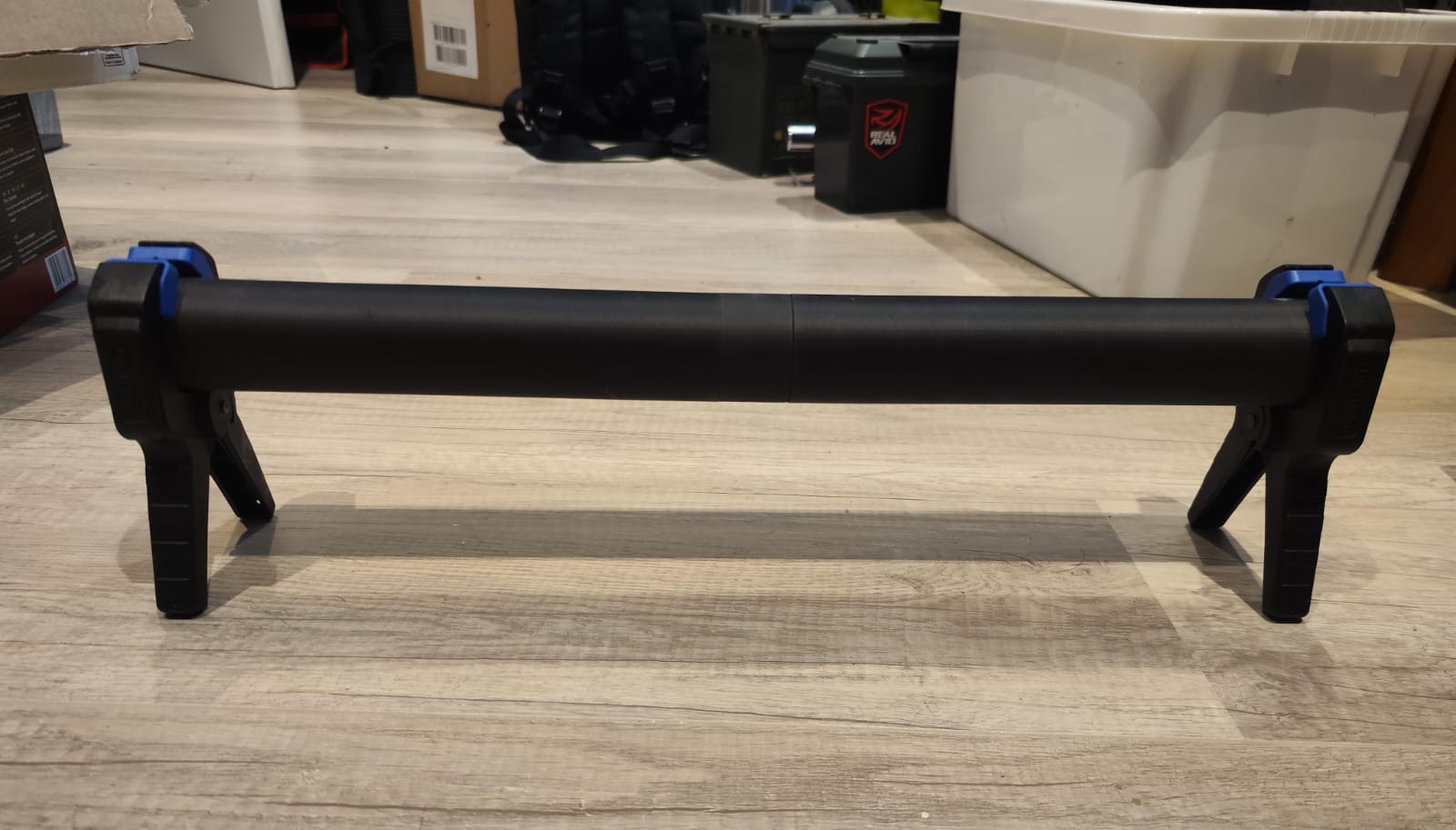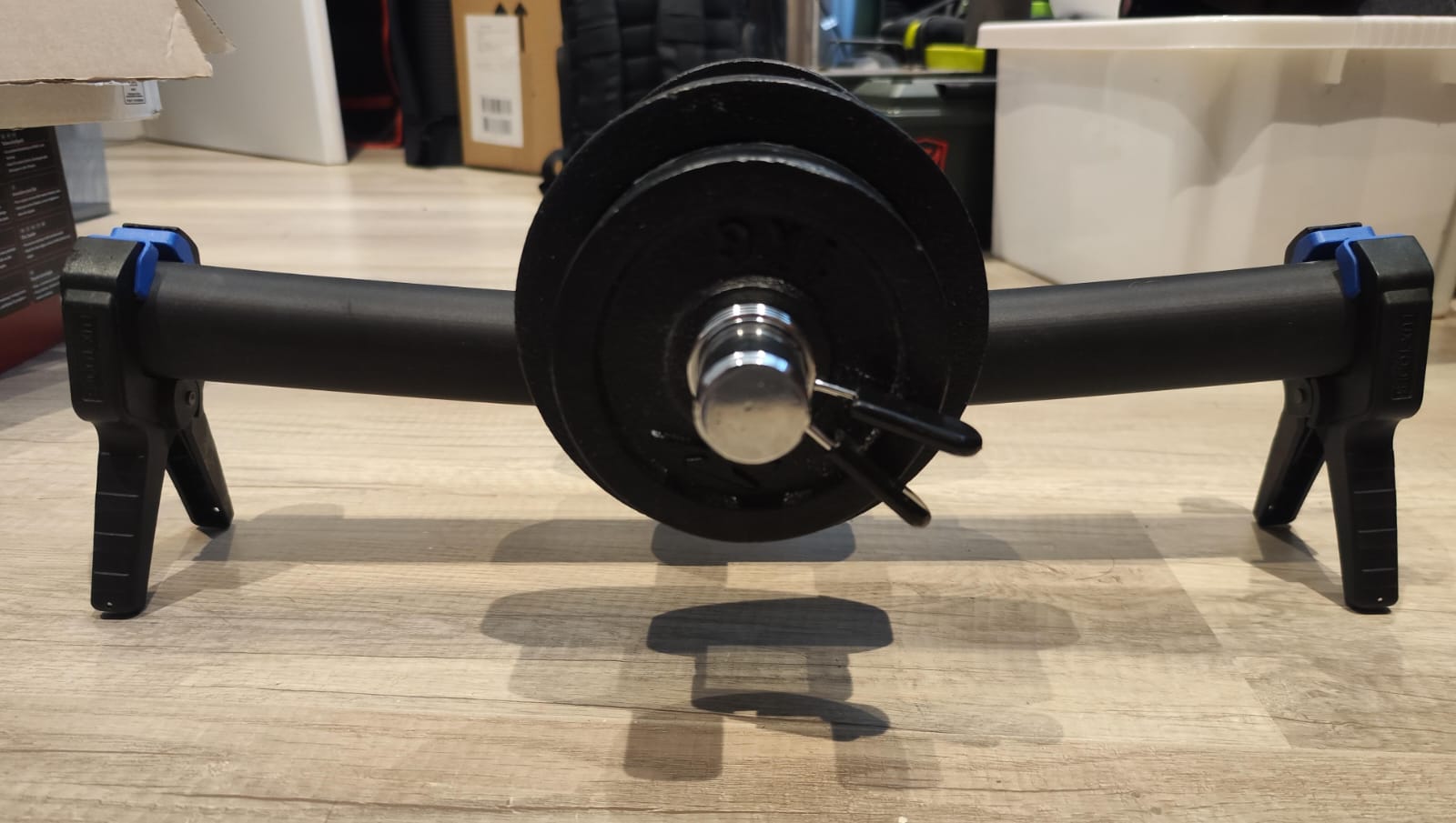 Aufbau: An den Enden habe die die Rohre mit einer Klammer "aufgebockt" und mittig mit einer 9kg (~90N) Hantel (war gerade da und ließ sich in der Mitte balancieren) belastet. Dabei die maximale Durchbiegung mit dem Messschieber gemessen: