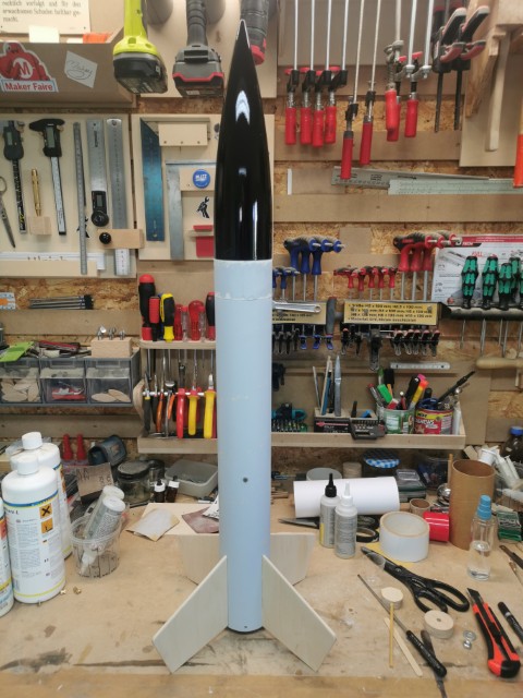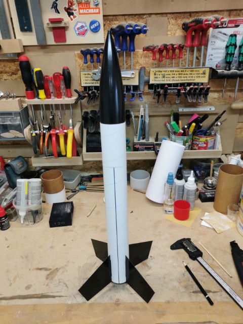 Hallo Andreas, ich hätte da noch einen Dragrace-Teilnehmer Bei der 3Zoll Version gab es eine Baupause, wegen Materialmangel  , so hab ich mal noch eine Version mit 50mm Klimarohr und fertiger schwarzer Spitze gestartet. Wird halt schwierig, beim Dragrace zwei Raketen zu verfolgen und bergen. Muss halt ein Kollege herhalten.. Vorlage hatte ich ja, Maße waren schnell geändert ! Für 4 x Klima D9( mal sehen ???) schon mal zusammen gesteckt: