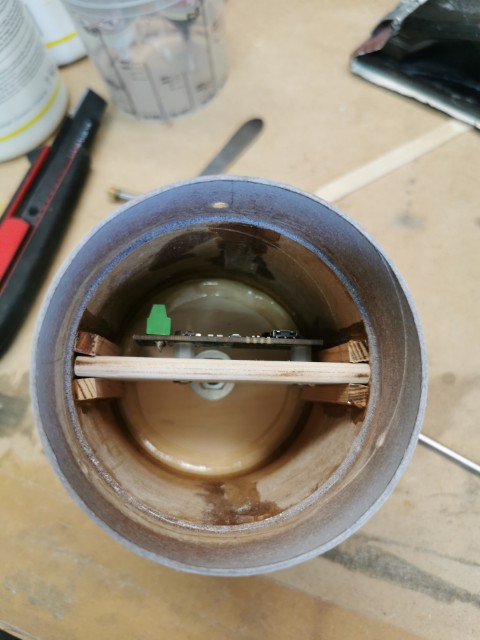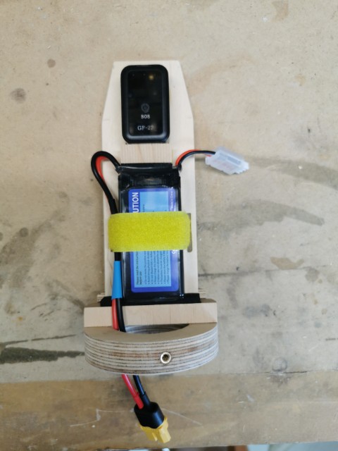 Die Spitze wird mit Akku und GPS-Tracker bestückt. Halter für Akku da ganze schon mal bestückt ! Das Ganze wird in die Spitze eingeschoben