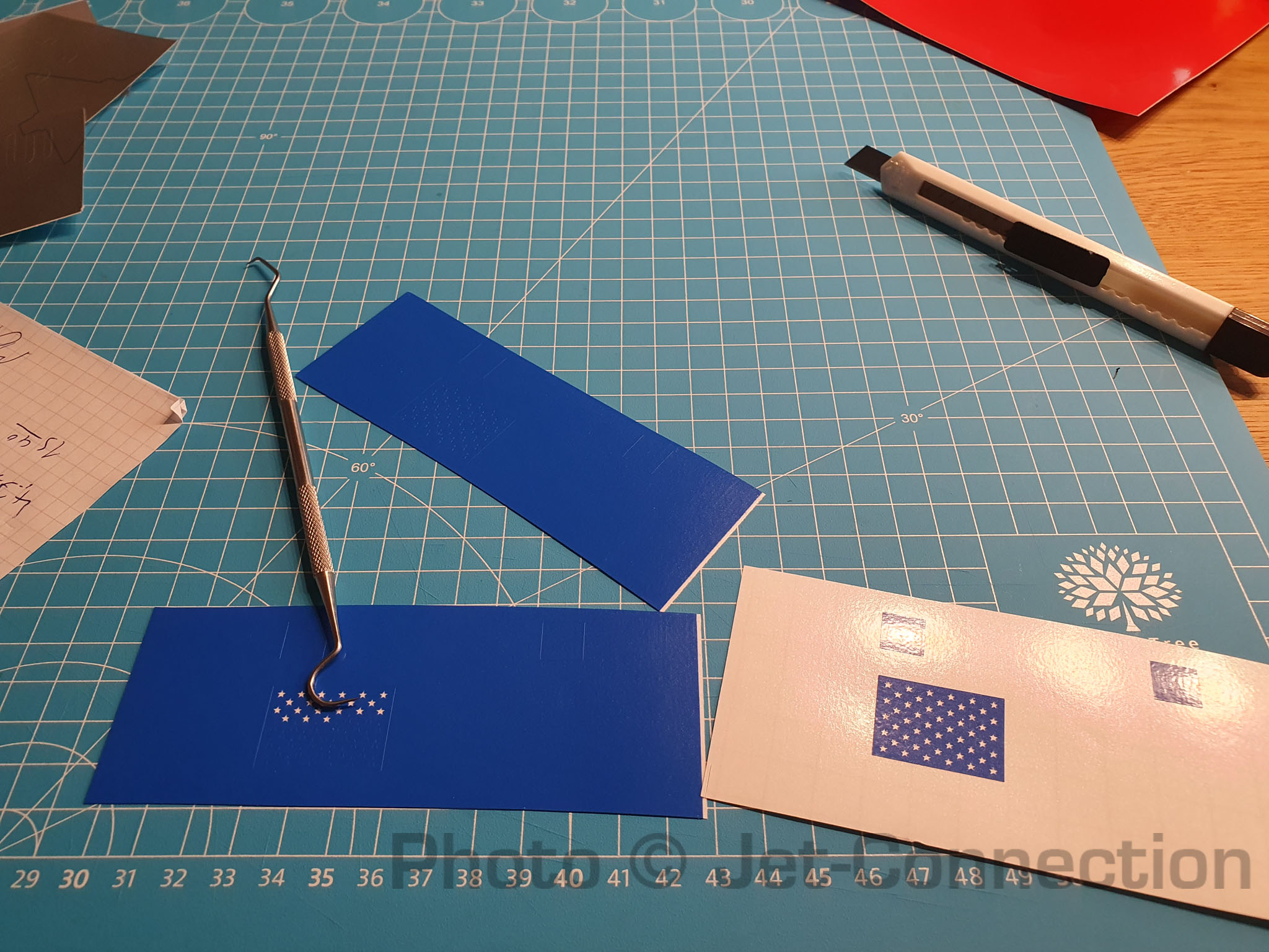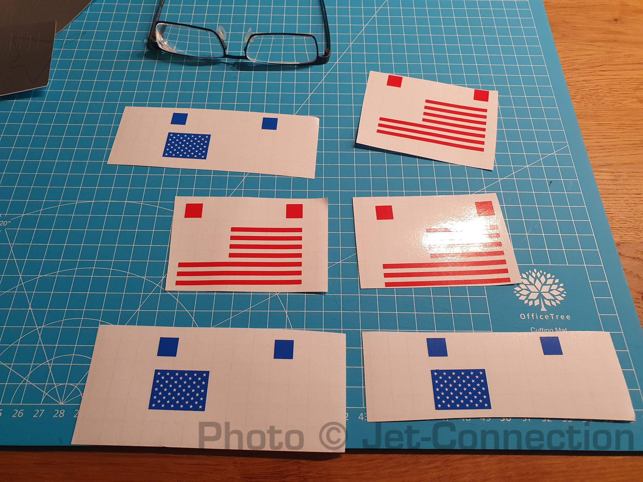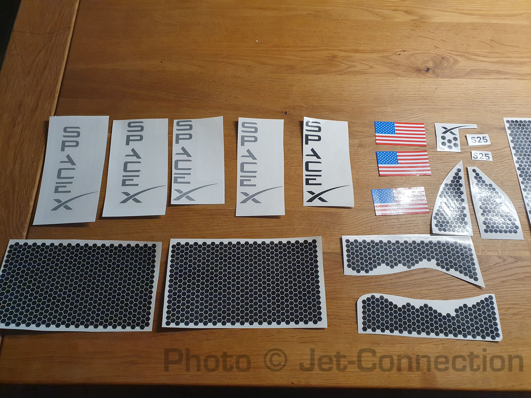 So... Der Plotter kriegt heute Kilometergeld  6 Stunden plotten und entgittern später... habe fertig. Geht nächste Woche raus... Erinnert mich daran das ich nur noch texanische Flaggen mache... Sterne... Sterne... Und so entsteht die Flagge: Irgendwie müsste ein Plotter erfunden werden der den ganzen Kram gleich entgittert  Roilli: Ich habe die SpaceX Schriftzüge zweilmal in silber, zweimal in grau und einmal in Schwarz geschnitten. Schau halt was Du am besten gebrauchen kannst. Von der Größe her sollte das jetzt alles nach Deinen Vorgaben sein. Die Flaggen haben keine Transferfolie, die roten und blauen Folien kleben direkt auf der weissen Grundfolie die Du vom Träger abziehen kannst. Alles andere ist wie gehabt mit Transferfolie belegt. Ich mach erstmal Pause