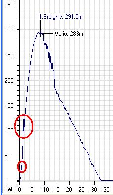 Hier die Daten eines Fluges mit einem AT I366, die Rakete ging dann noch auf 740m, Zeitindex 12.6 sec. Eine Auslösung, wie vom SALT detektiert, bei 2.4 Sekunden wäre also definitiv zu früh gewesen.: ******************************************************************** Höhe Flugzeit Geschwindigkeit ******************************************************************** 0 m | 0.0 s | 0 m/s 2 m | 0.2 s | 10 m/s 4 m | 0.4 s | 10 m/s 11.9 m | 0.6 s | 25 m/s 15.9 m | 0.8 s | 30 m/s 19.8 m | 1.0 s | 20 m/s 25.8 m | 1.2 s | 25 m/s 29.8 m | 1.4 s | 25 m/s 45.7 m | 1.6 s | 50 m/s 57.6 m | 1.8 s | 70 m/s 101.6 m | 2 s | 140 m/s 75.6 m | 2.2 s | 45 m/s 35.7 m | 2.4 s | -165 m/s ----------------------------------------------------------------------------- EREIGNIS: Gipfelpunktsauslösung 2.4 s ----------------------------------------------------------------------------- ----------------------------------------------------------------------------- EREIGNIS: Mindesthöhe 2.4 s ----------------------------------------------------------------------------- 81.6 m | 2.6 s | 15 m/s 113.6 m | 2.8 s | 195 m/s 141.7 m | 3 s | 150 m/s 171.9 m | 3.2 s | 146 m/s 204.2 m | 3.4 s | 156 m/s