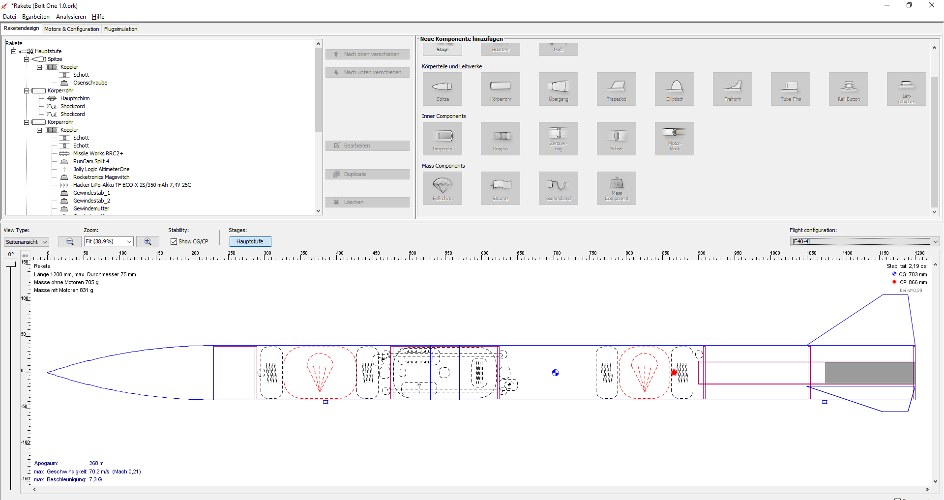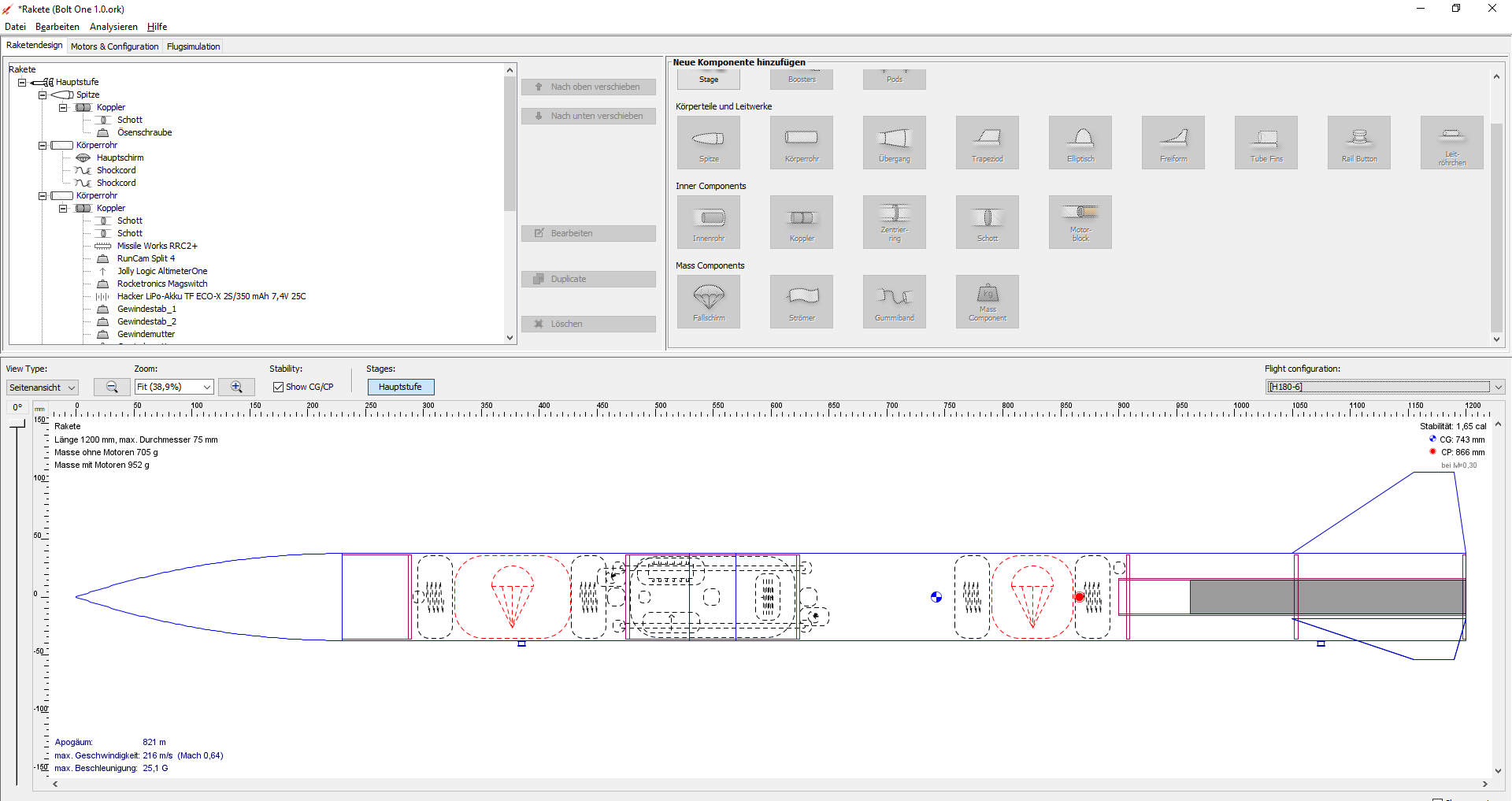 So sieht die Konstruktion in der OpenRocket Software aus. Wenn euch was auffällt, würde ich mich über Feedback freuen.