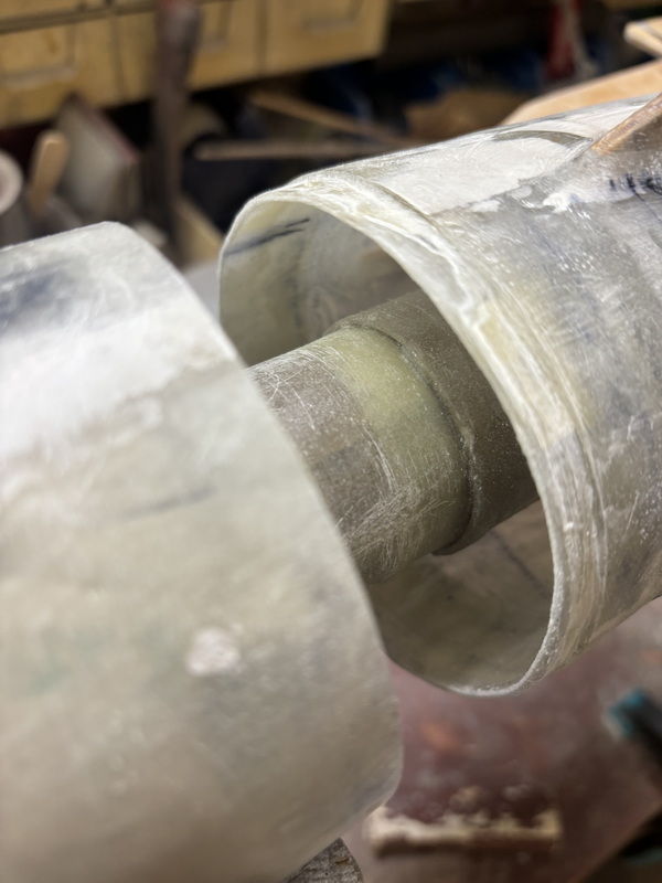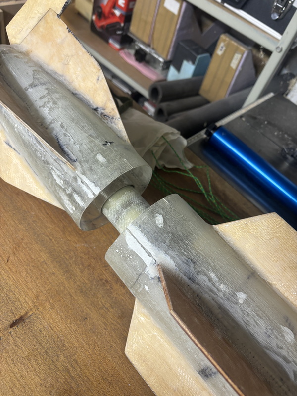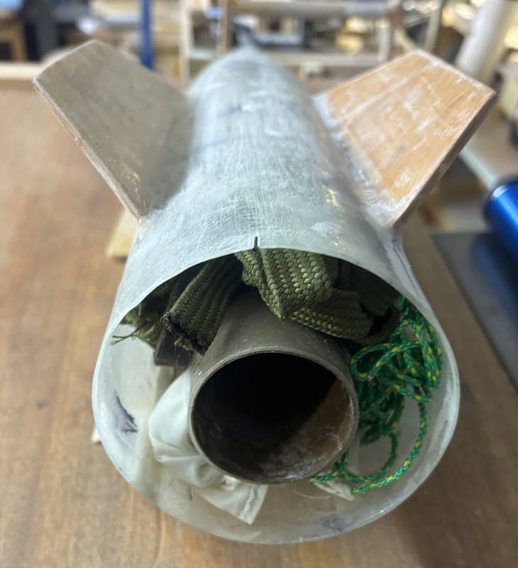 Schockband und Fallschirm werden zwischen Kupplerrohr und Außenwandung untergebracht. Das kuppeln funktioniert, alles passt und mir ist heute ein Stein von meinem Bastlerherz gefallen. Rolli