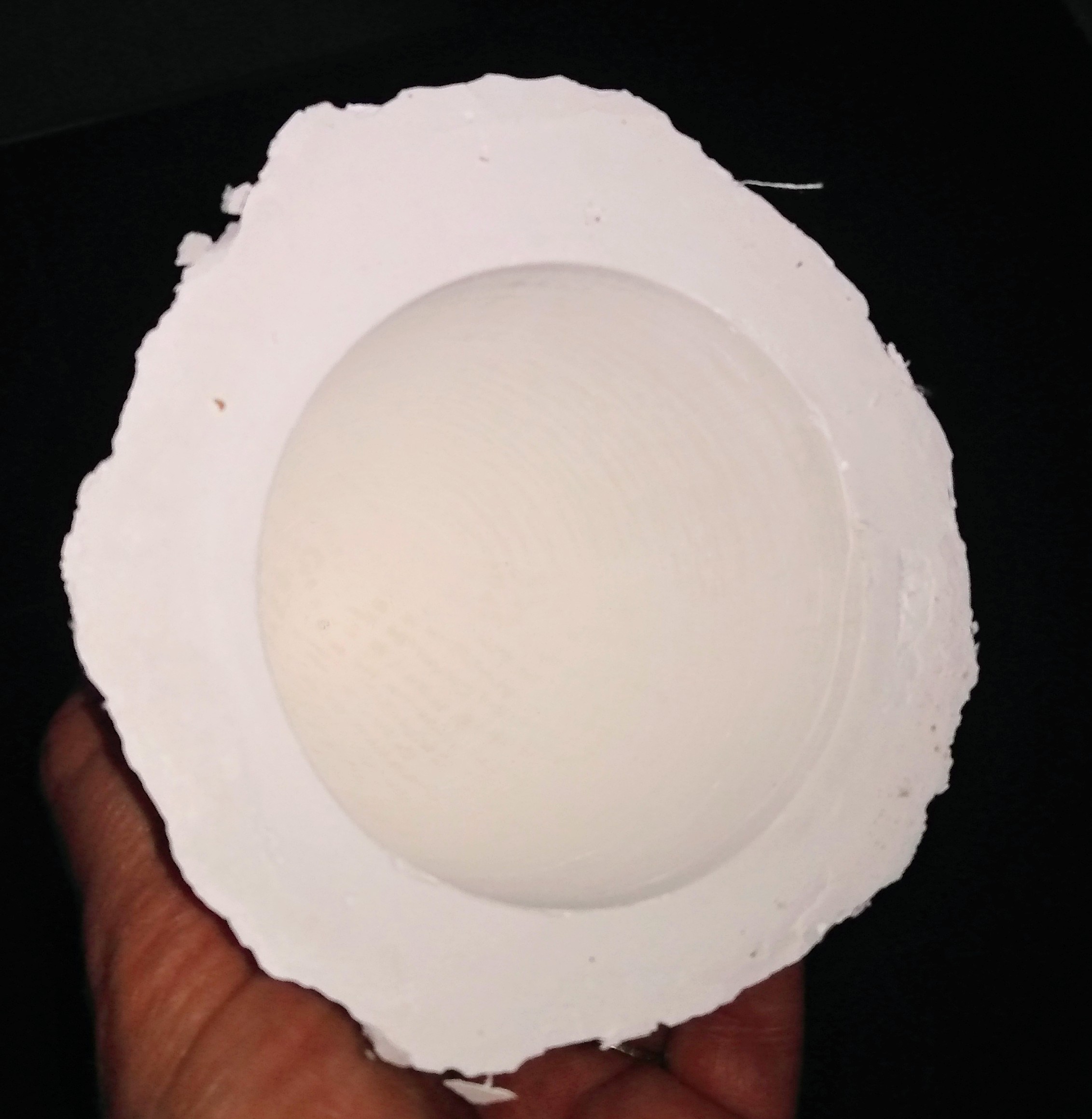 Nachdem mir die Hände jetzt nicht mehr wehtun vom vielen was auch immer, habe ich dann doch Gewalt anwenden müssen. Typischer Anfängerfehler, aber ich hätte den saugfähigen Gips erst versiegeln müssen vor Auftrag des Trennwachses. So blieb nur die Säge (nicht die Geile )smile . Trotzdem ganz OK geworden, auch wenn sich am Rand leider Blasen gebildet haben, die ich ausgleichen muss.
