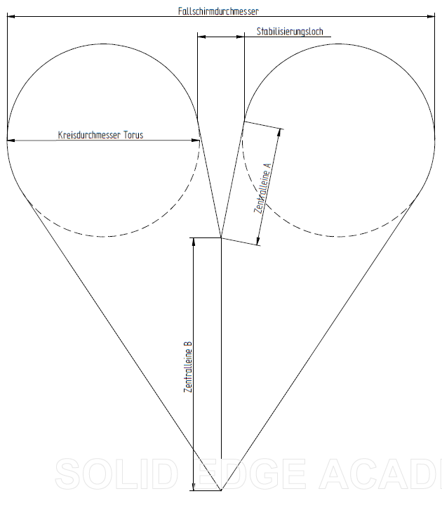 Die Länge der Zentralleinen wird so berechnet dass die Leine A innen tangential am Fallschirm anliegt. Wird das Stabilisierungloch in etwa gleich gewählt als das entsprechende Loch des Donuts werdend die Leinen A entsprechend lang.