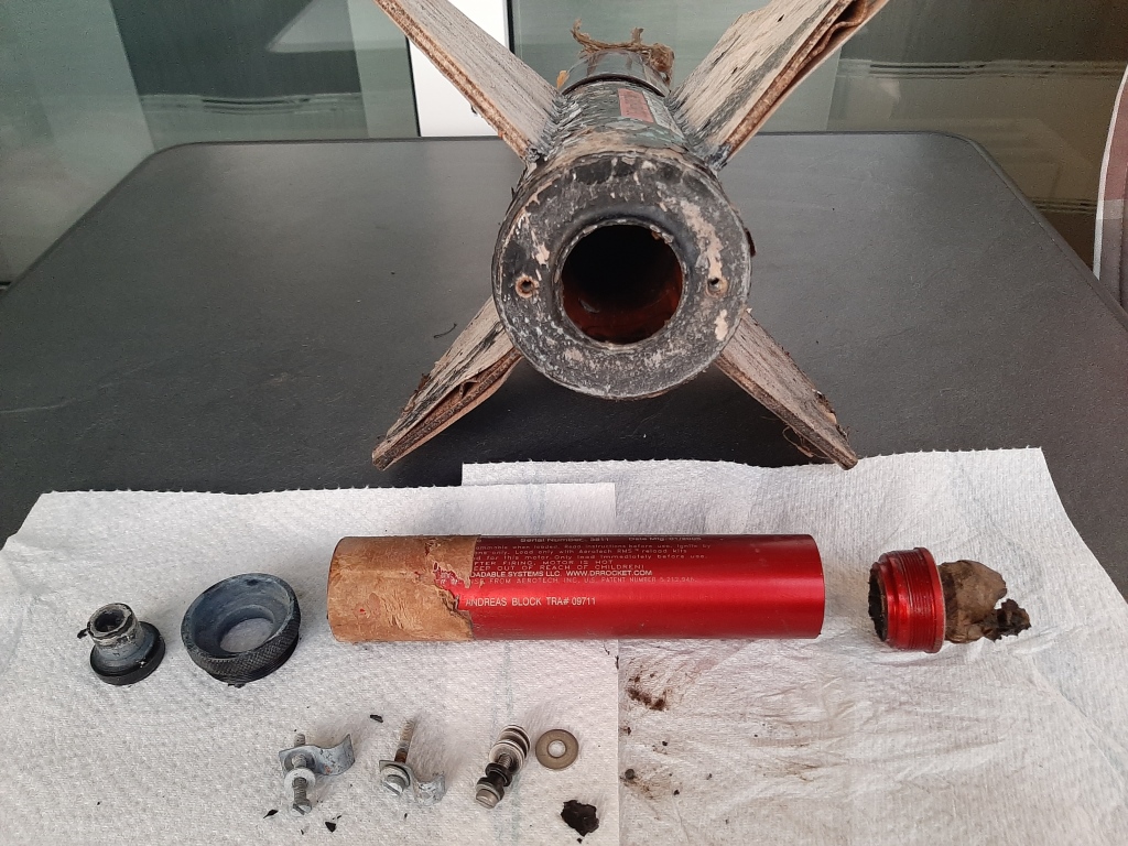 Jetzt ist es ja schon 27 Monate her, das sich meine "FAXE" in einem Baum im Roitzschjoraer Wald verheddert hatte. Bisherige Bergungsversuche blieben ja bisher leider erfolglos.... Da ich heute mal wieder in der Gegend war, dachte ich, ich könnte ja einfach mal wieder bei ihr vorbei schauen.... Und was soll ich sagen, die Kevlar-Schockleine hat nach fast 2 1/2 Jahren im Baum endlich "aufgegeben" und sie wieder frei gelassen... Vom Fallschirm ist nicht mehr viel übrig. Die Sperrholzflossen haben ihren Lackierung verloren und sind aufgebläht, Aber das wichtigste ist, das 38er Aerotech Casing hat das die lange "Hängezeit" gut überstanden und ließ sich auch sofort problemlos öffnen Und das lustige dabei ist, der Pfandflaschenautomat beim Netto hat den Strichcode der doch schon stark korrodierten Faxe-Büchsen noch erkannt und ganz brav die 25 Cent Pfand pro Büchse ausgezahlt...  ! Ich spiele ja mit dem Gedanken, die FAXE einfach noch mal neu zu bauen... Andreas