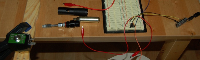 Was ist denn hier los? Ist Rolli der einzige der was baut? Neben dem Eggbot für die Tochter meiner Freundin  habe ich heute auch die China-Magnetventile getestet. Im Moment kommen ca. 16 Stöße à 100 ms aus einer 12 g-Patrone. Mal sehen was Patronenheizung und Verkürzung der Stöße noch daran ändern. Hier die Reste vom Versuchsaufbau: Mit billigen Biegebalken (3,70 EUR das Stück!) und noch billigeren Instrumentenverstärkern (ca. 1 EUR) von Ebay werde ich noch einen Schubmessstand bauen um zu sehen wie viel Schub CO2 so erzeugt. Vor allem um herauszufinden ob Expansionsdüsen überhaupt was bringen. Oliver