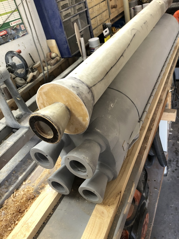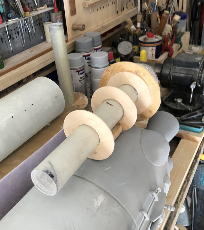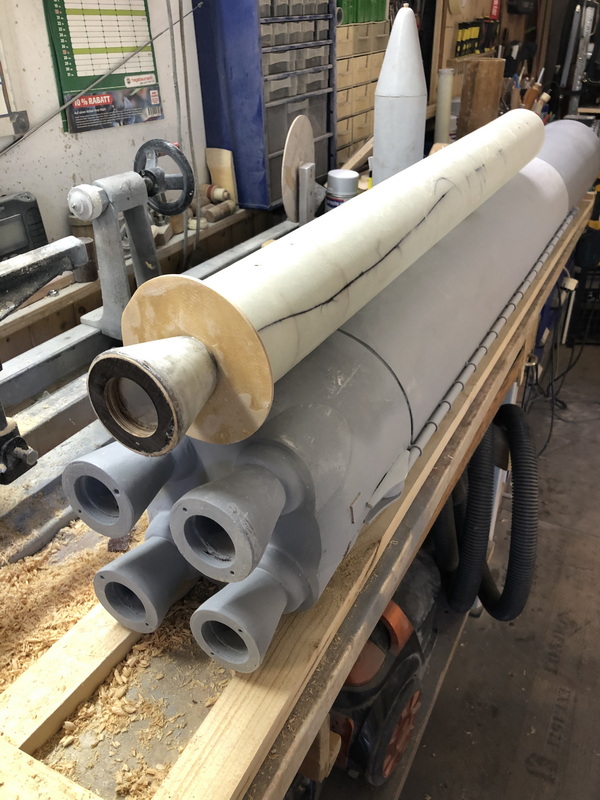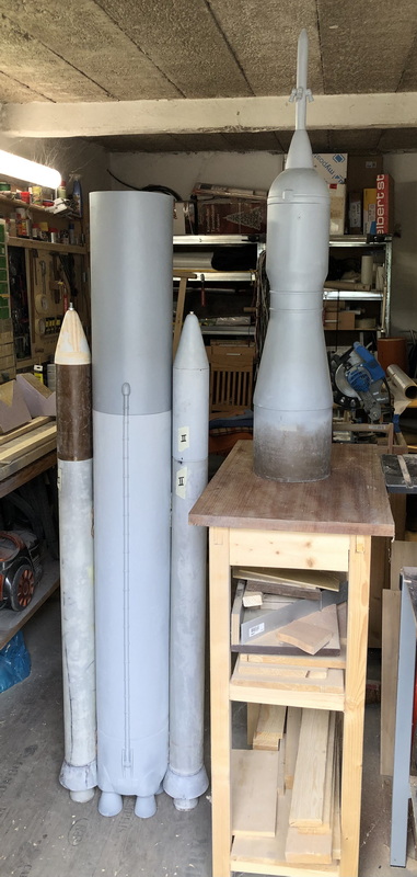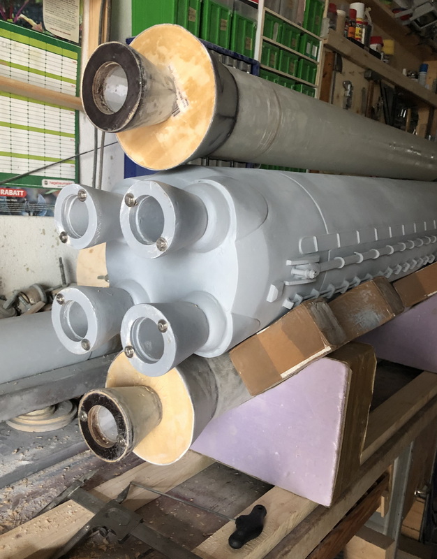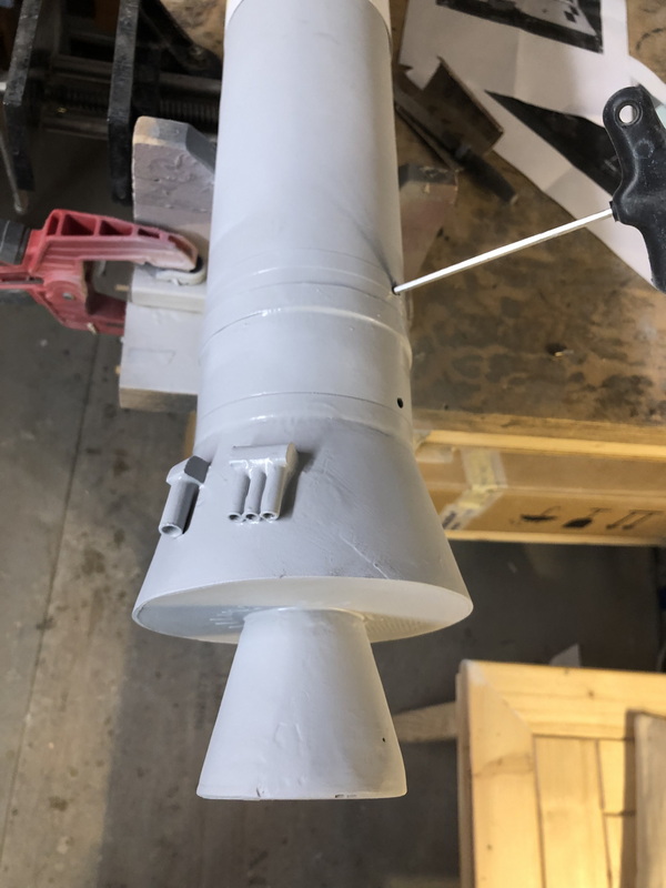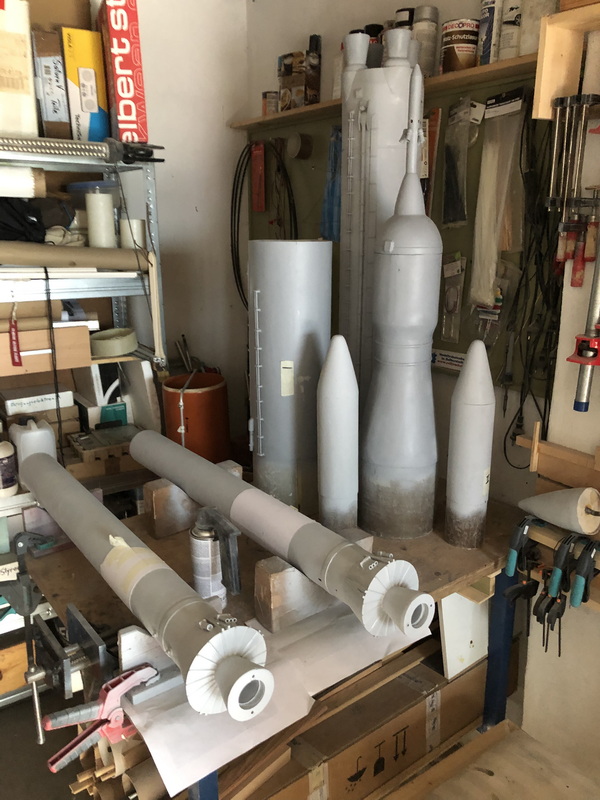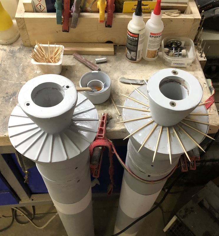 leider hat sich mir noch ein Fehler eingeschlichen. Ich muss die oberen Befestigungen nach weiter unten verlegen, da ja der Kuppler der Spitze seinen Platz braucht, und ich mir die Option offen lasse, dass aus dem Boosterrohr noch ein kleiner Fallschirm ausgestoßen werden kann. Also die Boosterspitzen können mit einer Ausstoßladung abgesprengt werden.