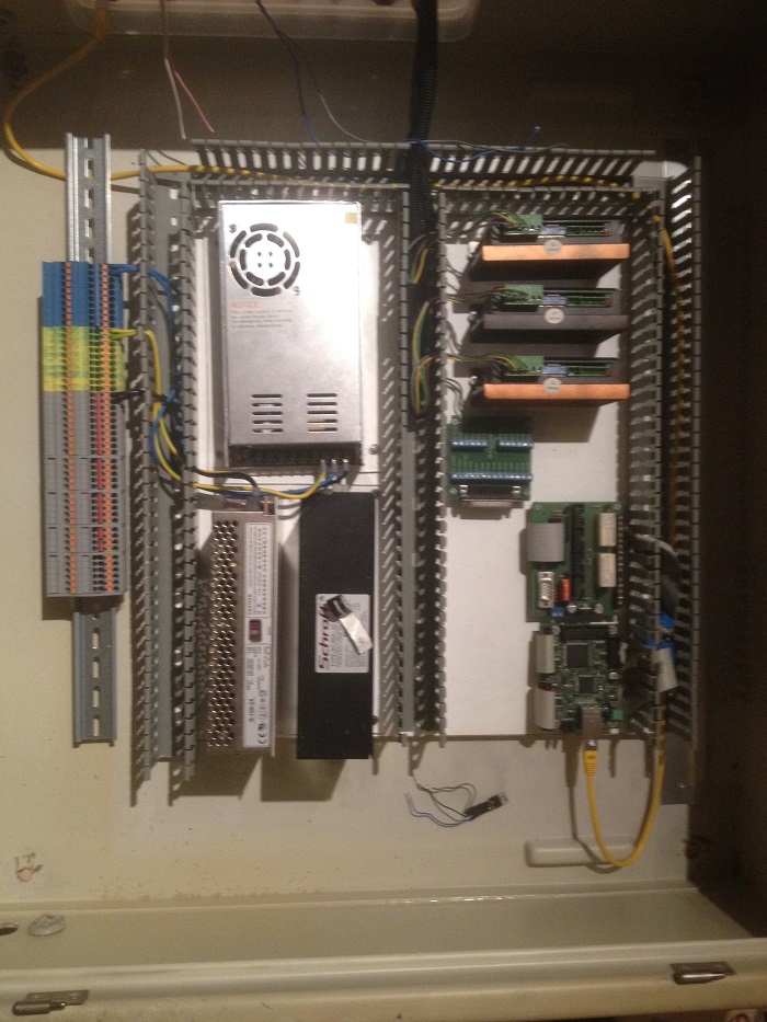 Ich habe nun endlich mal meine CNC-Steuerung in Angriff genommen. Die Steuerung nimmt nun in einem Schaltschrank Platz. Hier ist genug Raum für zwei weitere Netzteile, Steckdosen für alle Verbraucher(Rechner, Absaugung, Kühlung, etc.) und viele Stecker für Erweiterungen. Die Solid-State Relais und der Leistungsschütz für den Seitenkanalverdichter fehlen noch auf dem Bild, sowie etliche Meter Aderleitung. Ein paar Kabel sind noch in der Post, aber es wird langsam. Muss aber noch sehen, wo ich im Haus ein Dreiphasigen Anschluss setzen kann.