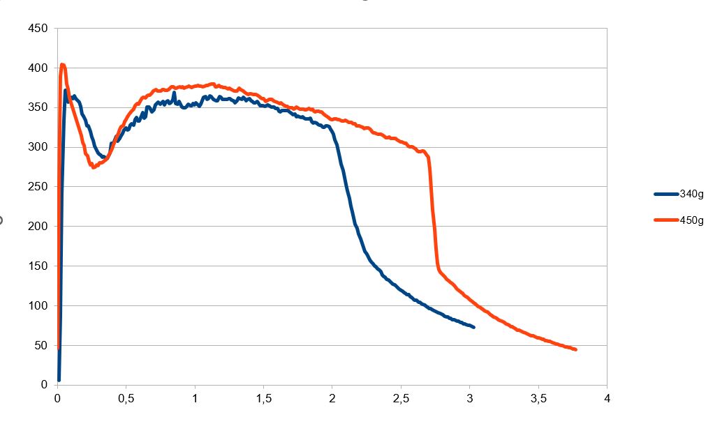 Hier noch die Schubkurven im Vergleich, nicht hauen wegen der fehlenden Achsenbeschriftungen etc. big grin es sind natürlich die passenden SI-Einheiten und . Im Video sieht man das "Tal" nach der Zündung auch sehr gut, da ist die Flamme noch sehr "mager" und man sieht schöne Mach-Diamanten. Danach schmilzt dann langsam das Grain richtig an und es wird auch ordentlich ABS verbrannt und nicht nur Lachgas zersetzt.