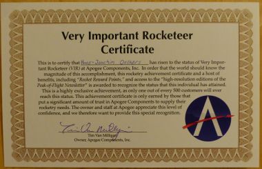 Nachdem ich im Juli(!) bei Apogee eine Bestellung aufgegeben hatte, kam diese genau in der Zeit an, als ich auf einer 10-tägigen Reise war, so dass sie nach der einwöchigen Frist wieder zurückging. Apogee versprach mir, ein Auge auf die Rücksendung zu haben und mir dann eine Gutschrift zu geben. Auf Nachfrage nach ca. einem Monat bekam ich die Antwort, dass solche Rücksendungen durchaus schon mal 3 bis 6 Monate dauern könnten. Da mir das Leben zu kurz erscheint, um auf eine Rücksendung zu warten, bat ich um Stornierung und bestellte neu. Irgendwann bekam ich dann von PayPal Gutschriften über beide Bestellungen, und im Konto tauchten beide als "storniert" auf. Also noch einmal bestellen und jetzt ist es eingetroffen: Immerhin bin ich jetzt zum Very Important Rocketeer aufgestiegen, was ja bei einer amerikanischen Firma durch ein entsprechendes Zertifikat bekundet werden muss, natürlich mit eigenhändiger Unterschrift von Tim van Milligan: Das Gute ist, dass ich jetzt Punkte im Wert von 10% des Kaufpreises erhalte, und natürlich prangt das Zertifikat jetzt in meiner Bastelkammer. Die Kosten für den vergeblichen Versand nahm Apogee auf seine Kappe. Und über ihren Service kann man nicht klagen. Gruß Achim Geändert von AchimO am 19. Dezember 2019 um 17:54 Tracking https://www.dropbox.com/scl/fo/zap4uvchueg080w0az5og/AOOqAeAiN2aSaAEPhiusKyk?rlkey=cuvsp1db08mrwq20gqqbpicg2&dl=0 Altimeter https://www.dropbox.com/sh/jw1nenfd45mzee3/AABZKjSB-_9DA-pLaVlOti-9a?dl=0 |